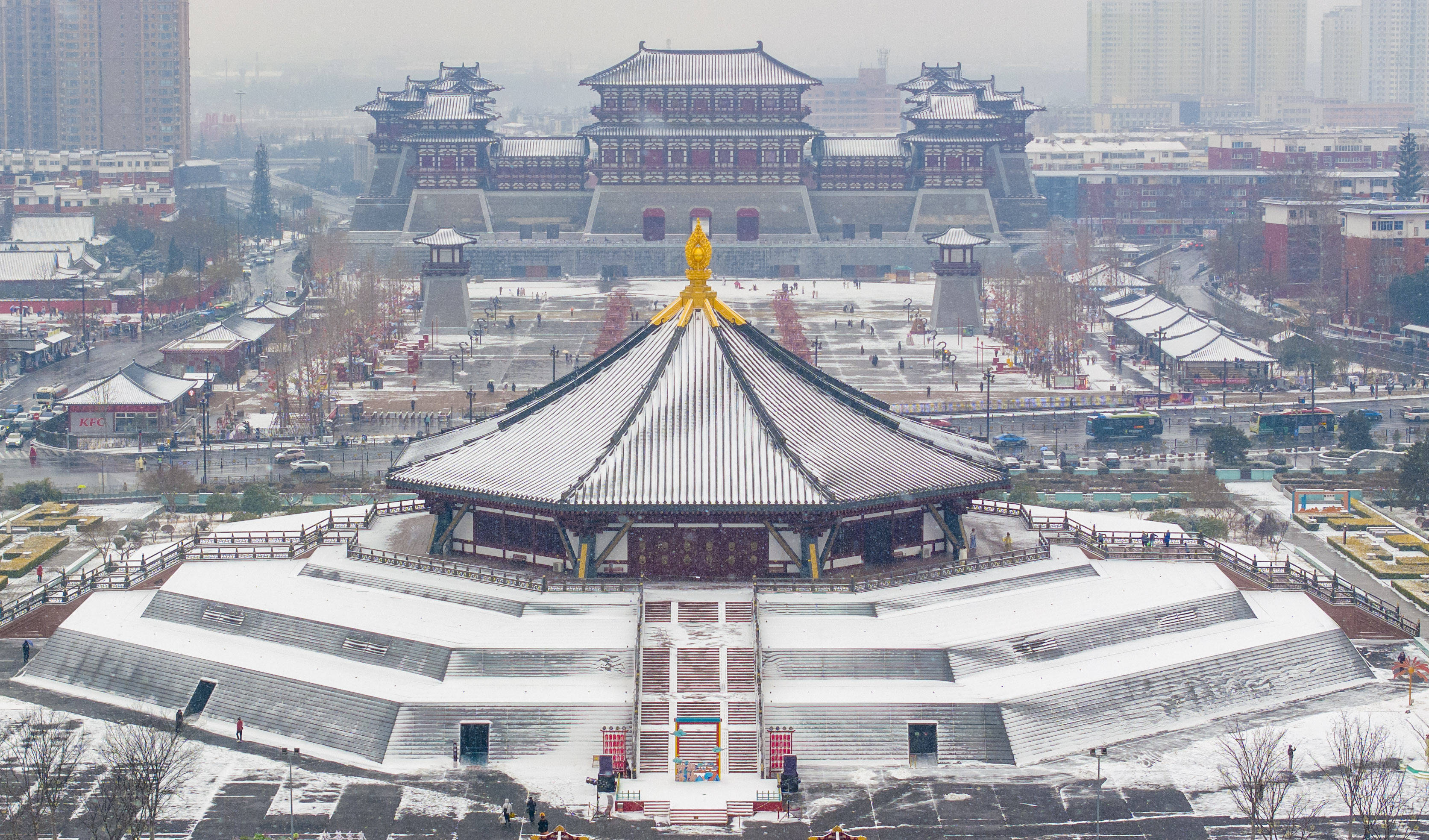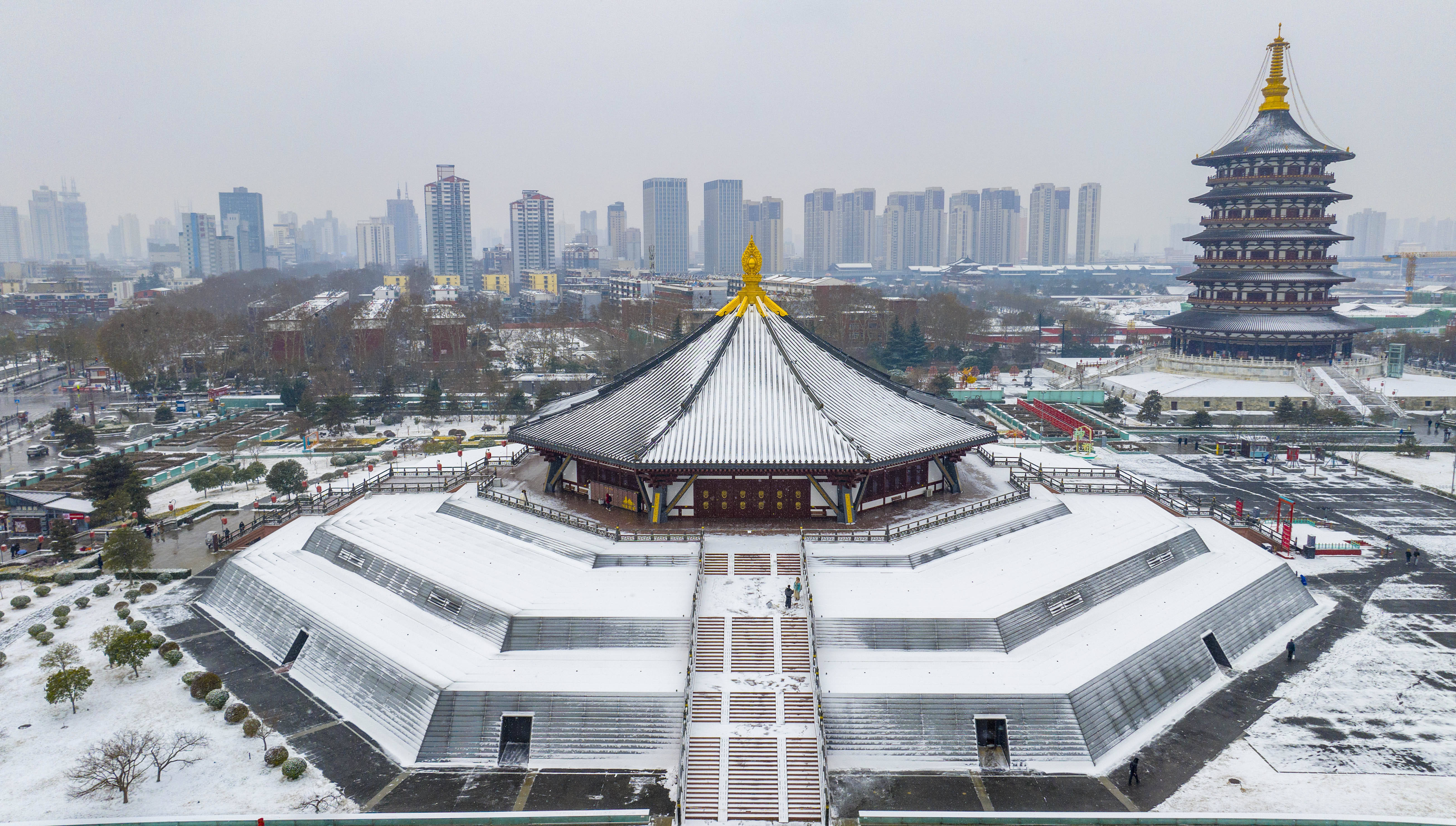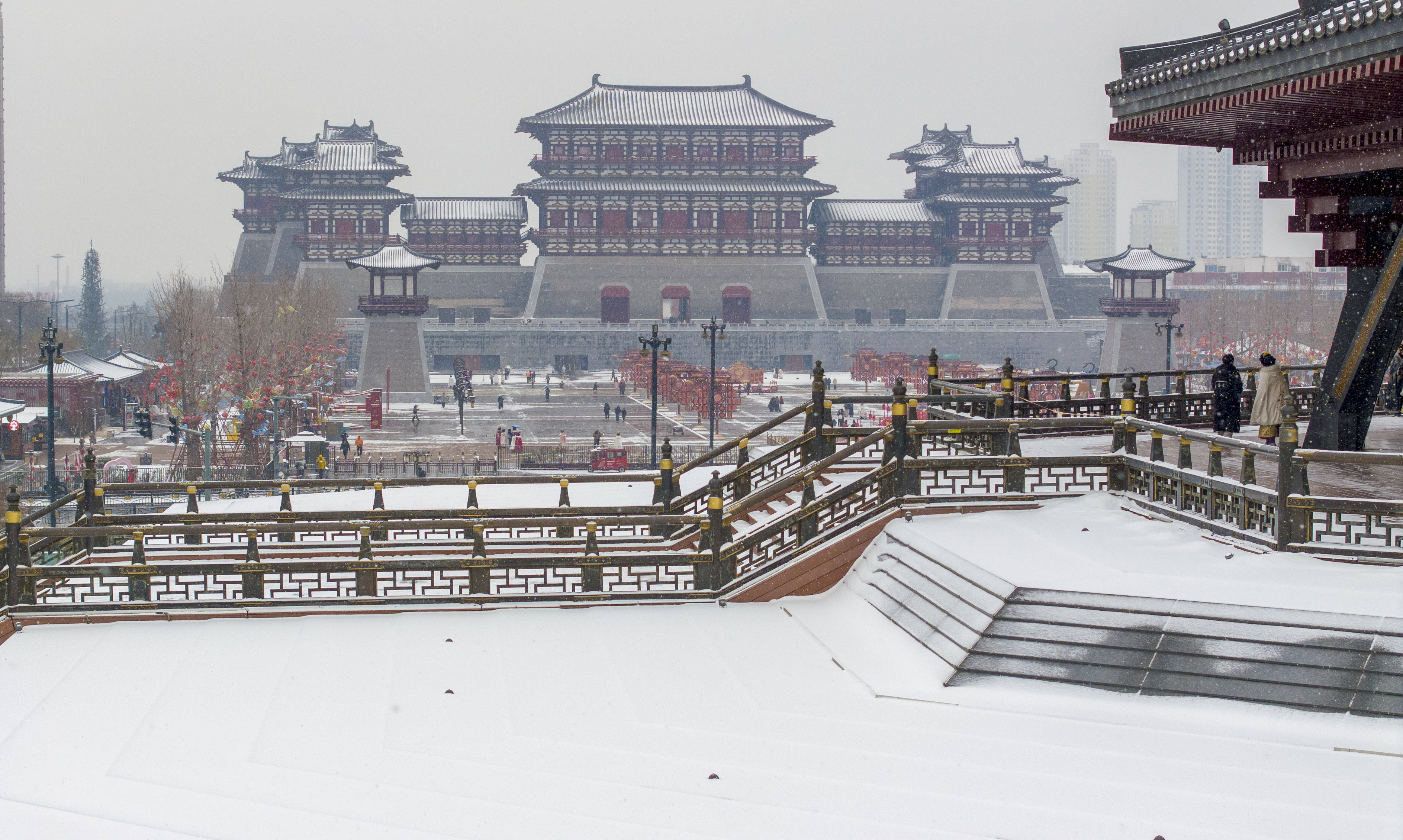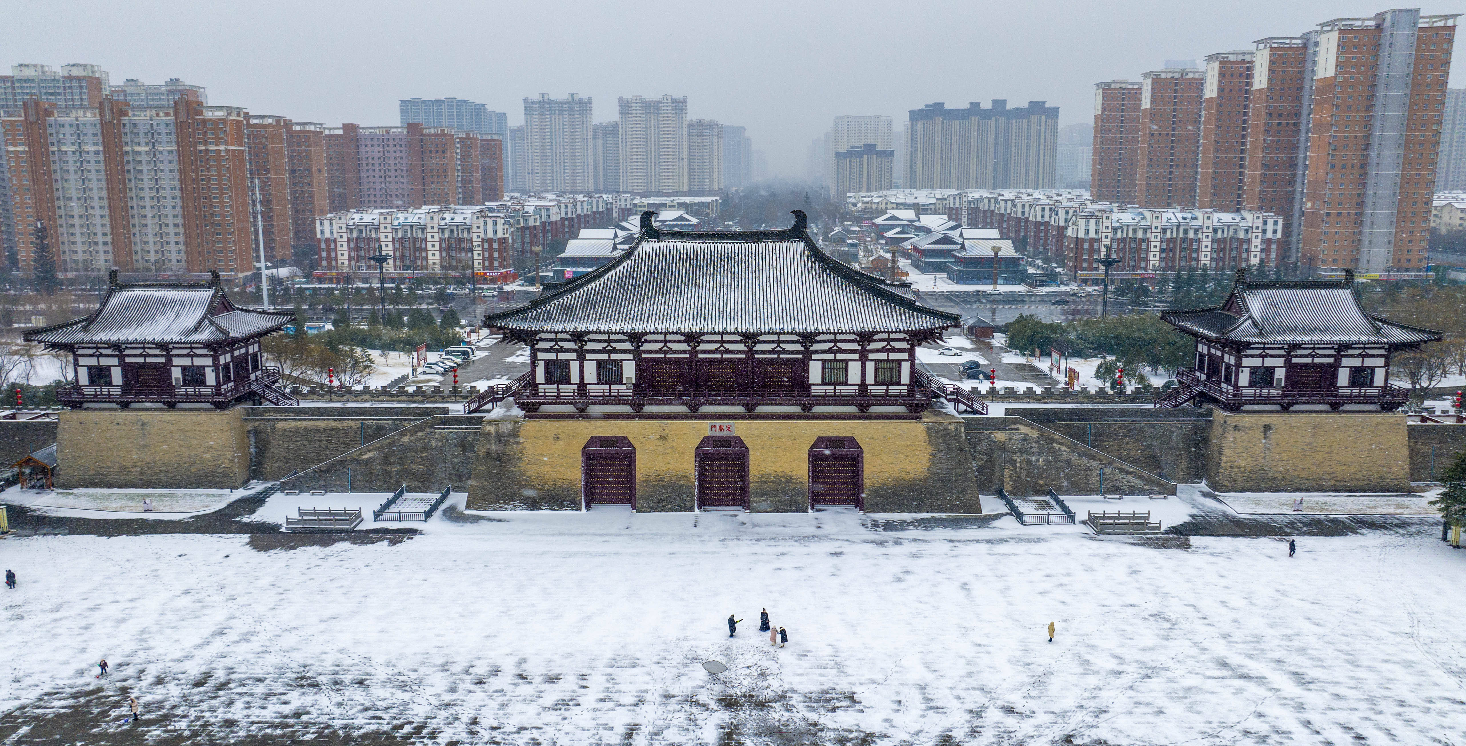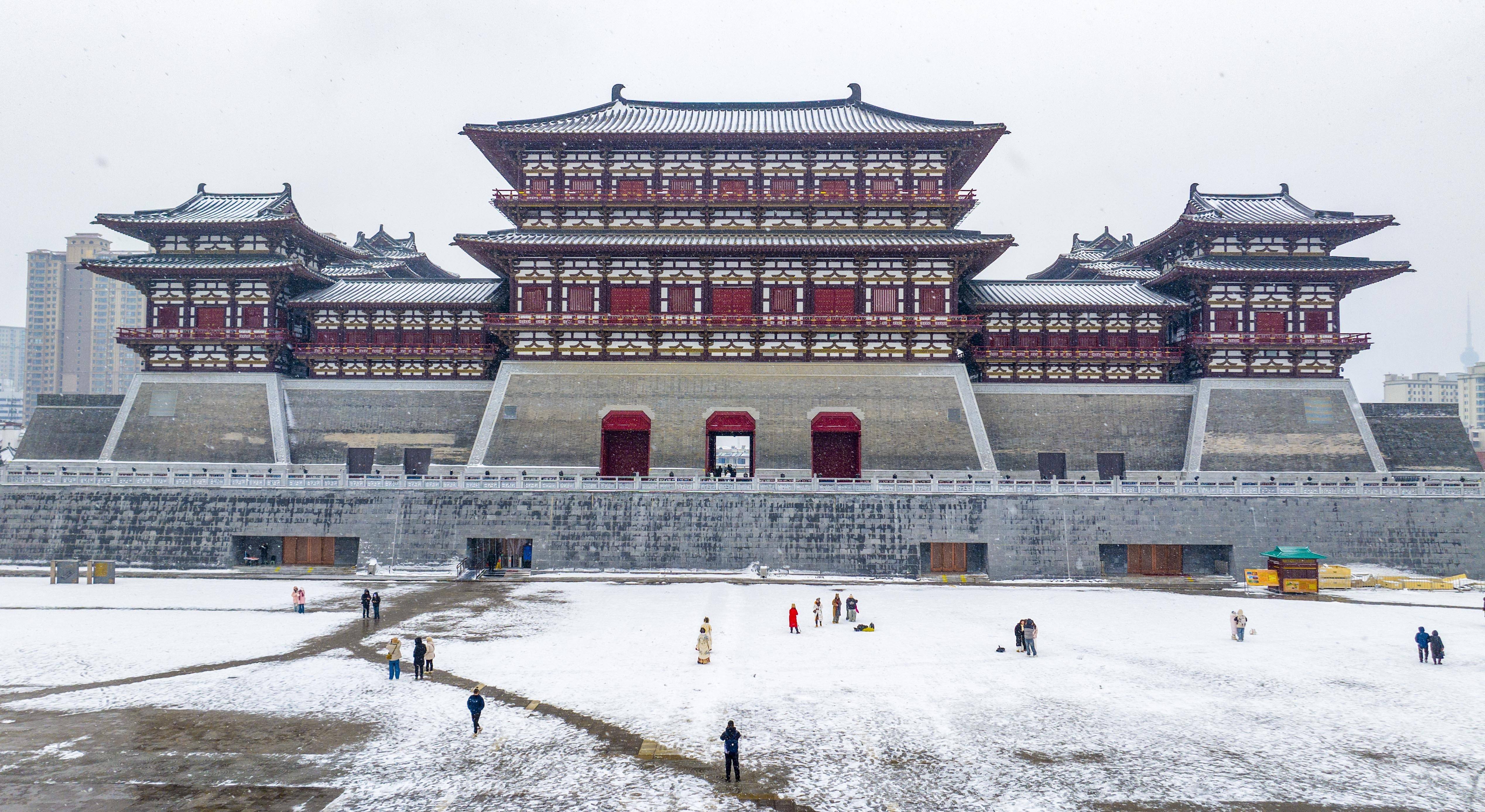 近日,河南省洛阳市迎来新年首场降雪,古色古香的建筑与白雪相互映衬,景美如画,吸引不少游人前来打卡拍照。