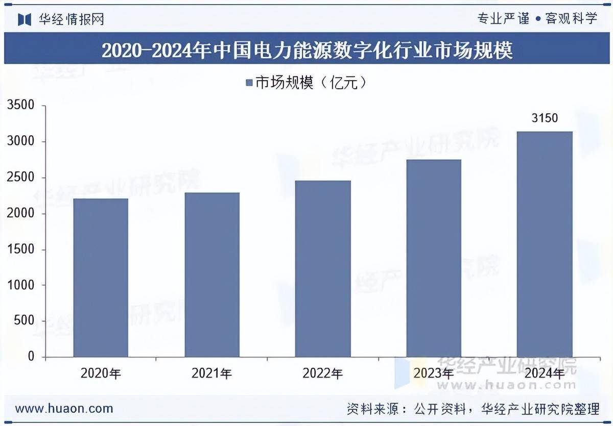 依托政策赋能与新型电力系统建设需求,2024年中国电力能源数字化行业市场规模稳步扩容,达到约3150亿元,同比保持稳健增长态势。当前市场需求呈现“全链条协同、技术深度融合”特征,电力央企数字化转型投入持续加大,民营企业在细分场景技术创新中快速突围,行业整体处于规模扩张与质量提升并行的发展阶段,为后续市场持续增长奠定坚实基础。