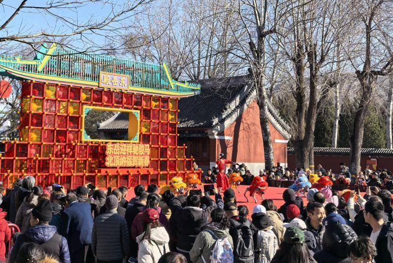 非遗传承与科技赋能的碰撞,是庙会的一大看点。广东潮響鼓社身着主题服饰演绎国家级非遗潮汕英歌舞,幡鼓齐动十三档、朝阳区东坝乡非遗金玲祖师及徐水舞狮等北方经典花会表演同步展演,内蒙古马头琴、川剧变脸等南北民俗技艺轮番登场,尽显非遗活态魅力。北顶娘娘庙内,机器人与仿生机器狗组成的祥狮战队献上“科技炫舞秀”,将人工智能与传统民俗深度融合,为古建庙宇注入新潮活力。