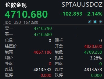 【大河财立方消息】3月19日,现货黄金日内跌超100美元,现报4710.68美元/盎司,跌幅2.14%。