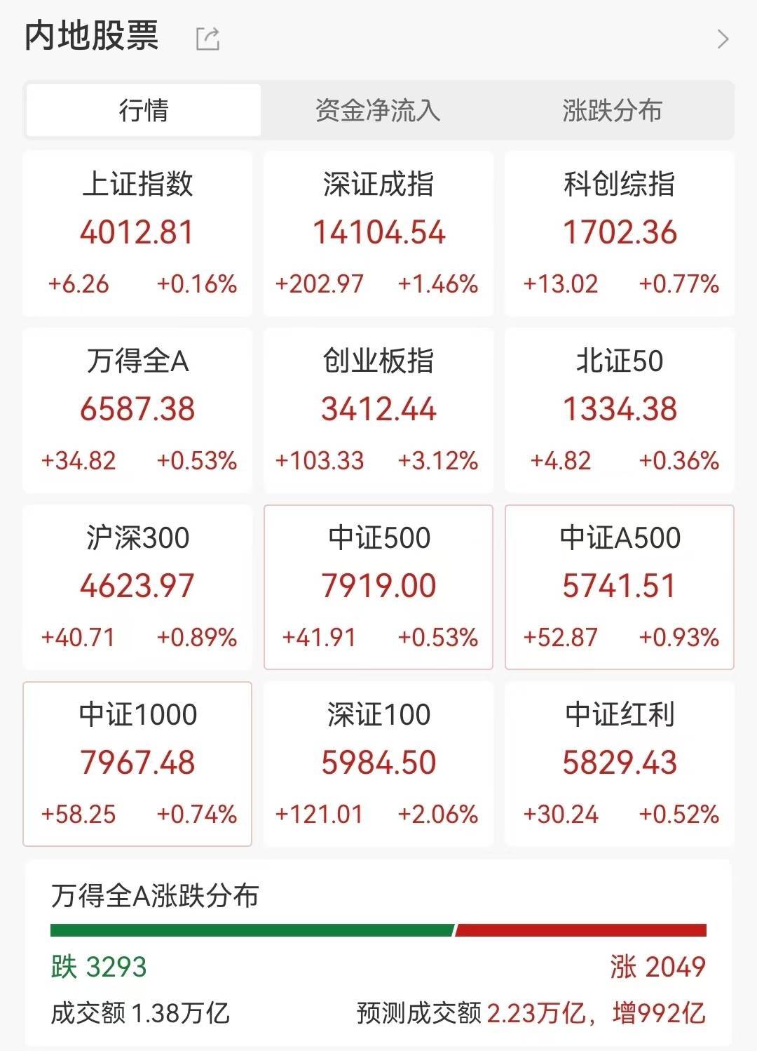 【大河财立方消息】3月20日,A股市场震荡走高,截至发稿,沪指再次翻红,涨0.16%,重回4000点;深证成指涨1.46%,科创综指涨0.77%,创业板指数涨超3%。光伏概念股爆发,上能电气20cm涨停,首航新能涨逾19%,九洲集团、艾罗能源涨逾15%,锦浪科技、昱能科技涨逾14%。沪深京三市上涨个股超2000只,创业板指权重股宁德时代、中际旭创、新易盛、阳光电源、天孚通信、亿纬锂能等大幅走强。