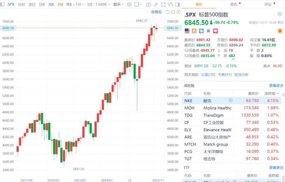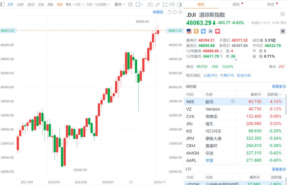 美股三大指数小幅收跌,连续三年录得超两位数涨幅。纳指跌0.76%,12月累跌0.53%,2025年累涨20.36%;标普500指数跌0.74%,12月累跌0.05%,终结月线七连涨,2025年累涨16.39%;道指跌0.63%,12月累涨0.73%,录得月线八连涨,2025年累涨12.98%。
