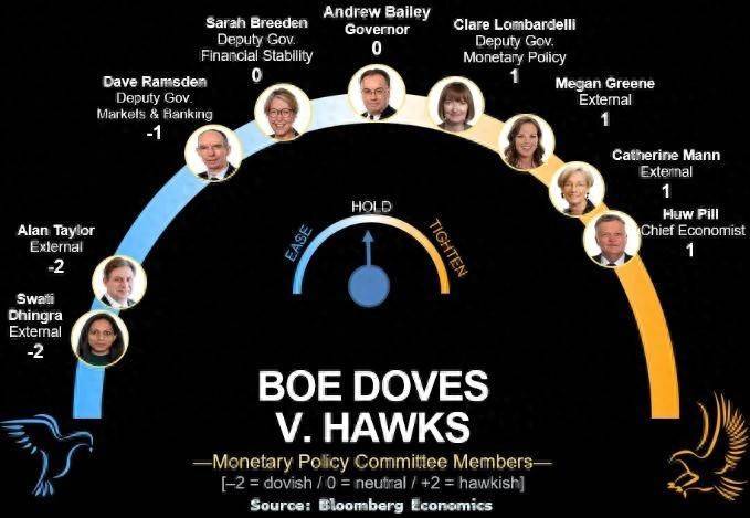 预计英国央行不会修改这一新的指引,这反映出目前的政策接近中性,因此委员会需要更加谨慎行事。鹰派成员,例如外部成员梅根·格林和首席经济学家休·皮尔,仍然对高通胀预期感到担忧。另一方面,鸽派成员丁格拉和泰勒则受到劳动力市场疲软的影响。