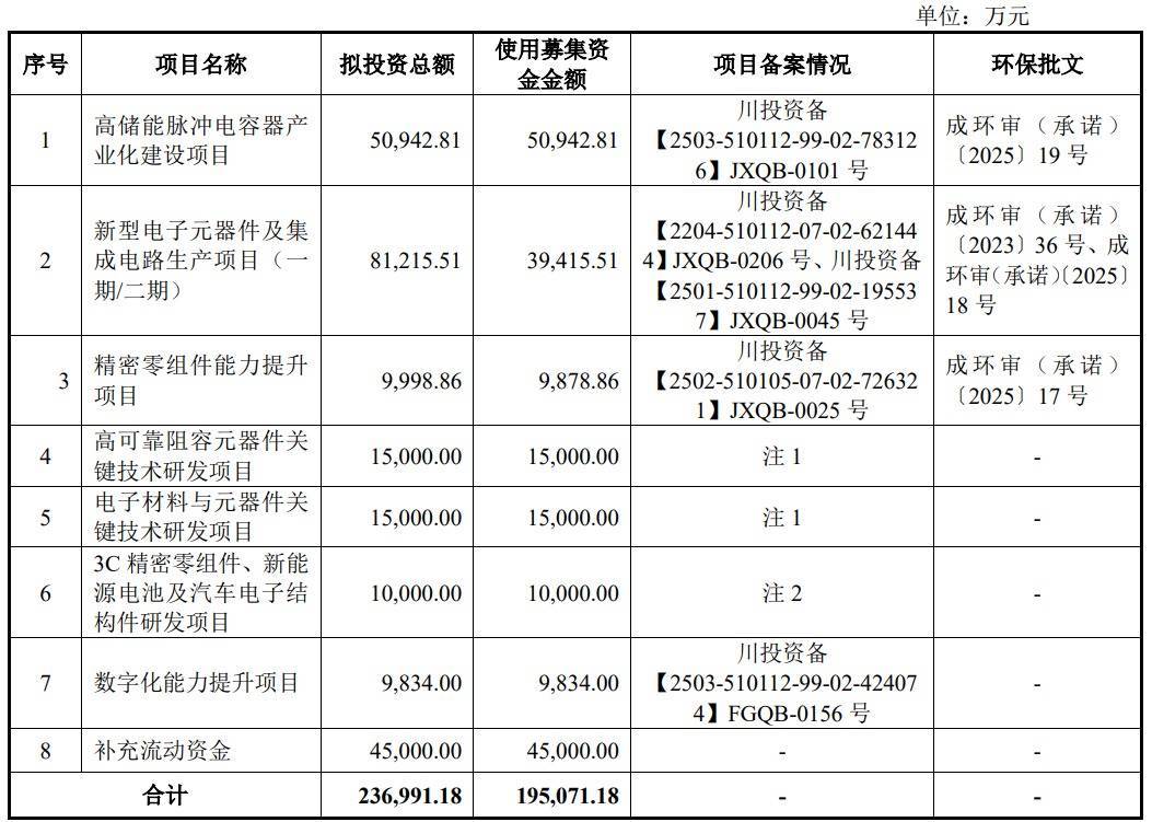宏明电子2026年3月20日披露的招股书显示,公司拟募集资金195,071.18万元,用于“高储能脉冲电容器产业化建设项目”、“新型电子元器件及集成电路生产项目(一期/二期)”、“精密零组件能力提升项目”、“高可靠阻容元器件关键技术研发项目”、“电子材料与元器件关键技术研发项目”、“3C精密零组件、新能源电池及汽车电子结构件研发项目”、“数字化能力提升项目”、“补充流动资金”。