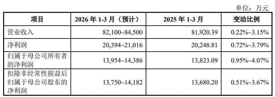 宏明电子预计2026年一季度营业收入为82,100万元至84,500万元,同比增长0.22%至3.15%;净利润为20,394万元至21,016万元,同比增长0.72%至3.79%;归属于母公司股东净利润为13,954万元至14,386万元,同比增长0.95%至4.07%;扣除非经常性损益后归属于母公司股东的净利润为13,750万元至14,182万元,同比增长0.51%至3.67%。