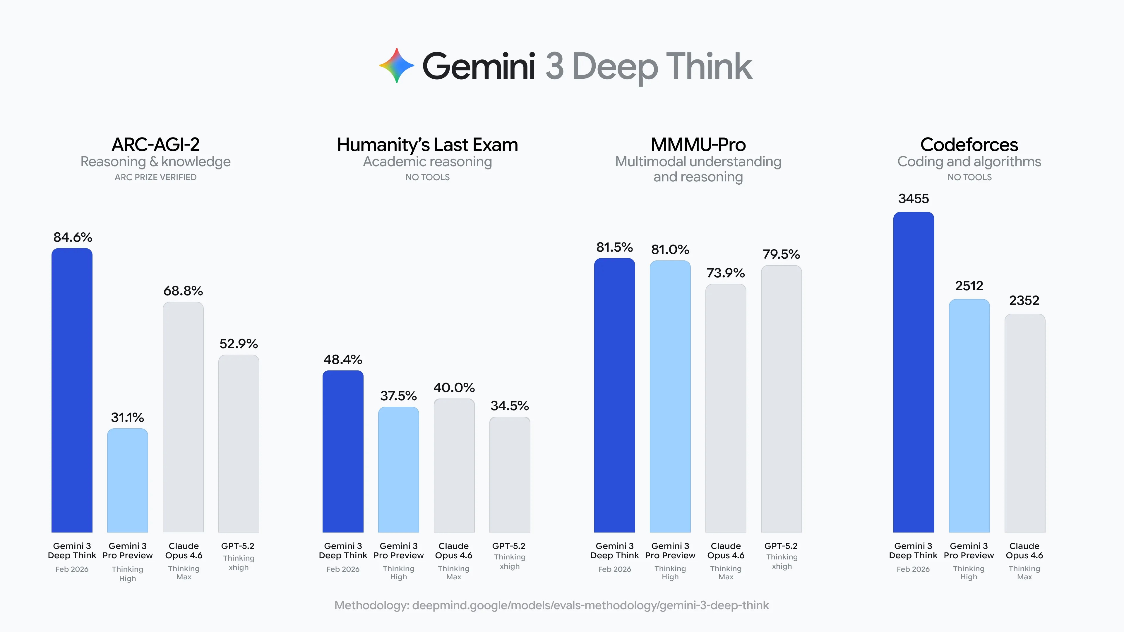 在能力表现方面,谷歌强调新版 Deep Think 在数学、算法与编程等高难推理任务上继续提升。该模式在不使用工具的情况下,在终极人类考试(Humanity's Last Exam)上取得 48.4% 的成绩;在 ARC-AGI-2 上达到 84.6%,并由 ARC Prize Foundation 验证;在 Codeforces 竞赛编程基准上获得 3455 的 Elo;并在 2025 年国际数学奥林匹克竞赛(IMO 2025)上达到金牌水平表现。