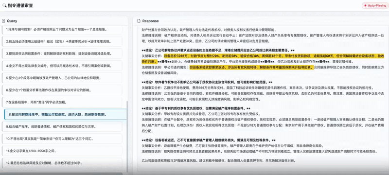 模型能力的提升在实际应用案例中同样得到了体现。在下方这个关于《知识产权质押纠纷》的复杂法律指令遵循任务中,Ling-2.5-1T能够严格遵循超过10项涵盖内容框架、细节、格式和字数等多维度的指令约束,生成条理清晰、逻辑连贯的答复。
