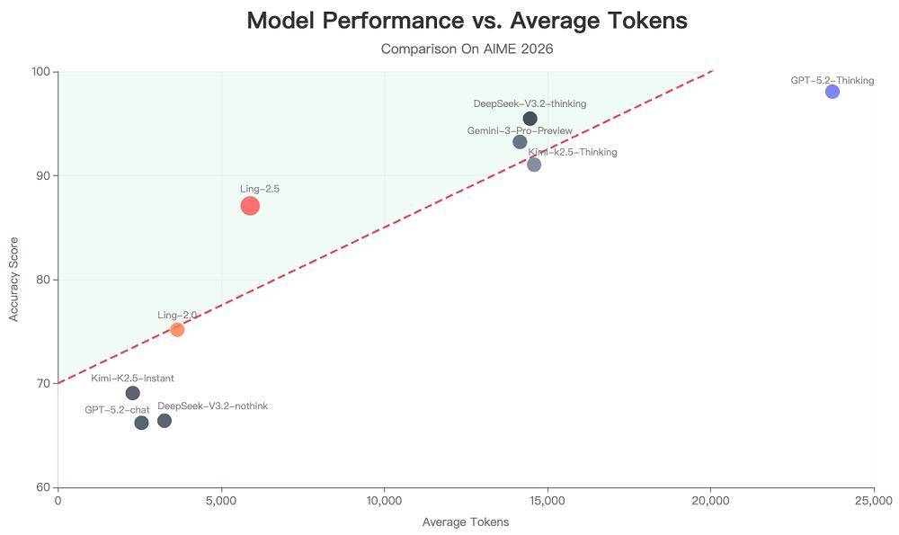 以AIME 2026评测为例,当平均输出长度约为5890个token时,新一代Ling-2.5-1T模型的表现显著超越前代Ling-1T,并已逼近前沿思考模型的水平。值得注意的是,后者通常需要生成15000到23000个token才能完成同样复杂的任务。