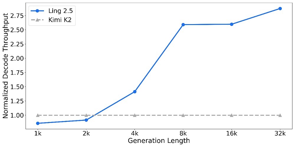 得益于Ling 2.5这一新架构,模型在长文本生成与长程推理场景中,将访存规模压缩至传统架构的1/10,生成吞吐量达原来的3倍。换言之,它让模型在“变聪明”的同时,也学会了“省着花”。