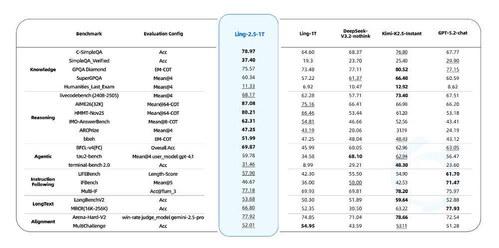 同时,效率的提升并未以性能为代价。在涉及推理、智能体、指令遵循、长上下文等场景的多项基准测试中,Ling-2.5-1T超越了DeepSeek-V3.2-nothink、Kimi-K2.5-Instant和GPT-5.2-chat等同类型的即时模型。
