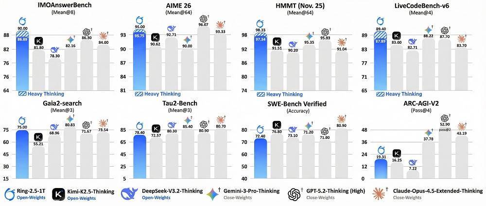 而Ring-2.5-1T则在国际数学奥林匹克竞赛(IMO 2025)和中国数学奥林匹克(CMO 2025)达到金牌水平(自测分数为IMO 35分、CMO 105分),开启重度思考(Heavy Thinking)模式后,它在IMOAnswerBench、HMMT-25等数学竞赛推理基准和LiveCodeBench-v6代码生成基准中,超越所有对比模型,无论开源闭源。