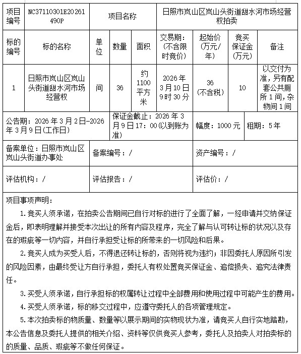 受日照市岚山区岚山头街道甜水河居股份经济合作社委托股票杠杆第三方平台,定于2026年3月10日9时30分通过山东省公共资源交易平台农村“三资”网上交易系统(以下简称交易系统)对日照市岚山区岚山头街道甜水河市场经营权实施(拍卖)网上交易。现将有关事宜公告如下: