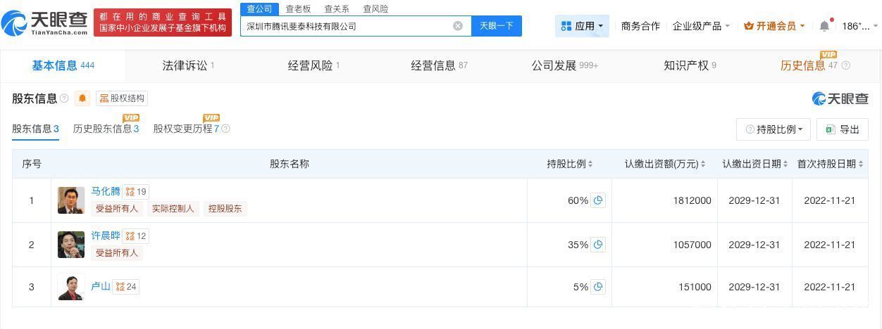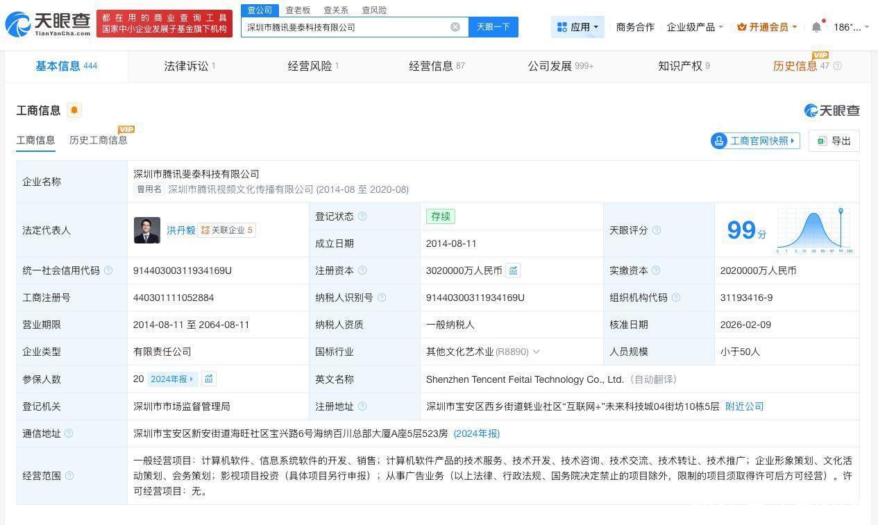 天眼查App显示,出品方腾讯视频关联公司深圳市腾讯斐泰科技有限公司成立于2014年8月,法定代表人为洪丹毅,注册资本302亿人民币,经营范围包括影视项目投资,从事广告业务等。股东信息显示,该公司由马化腾、许晨晔、卢山共同持股。此外,该公司于去年1月注册资本由202亿增至302亿,增幅约50%。
