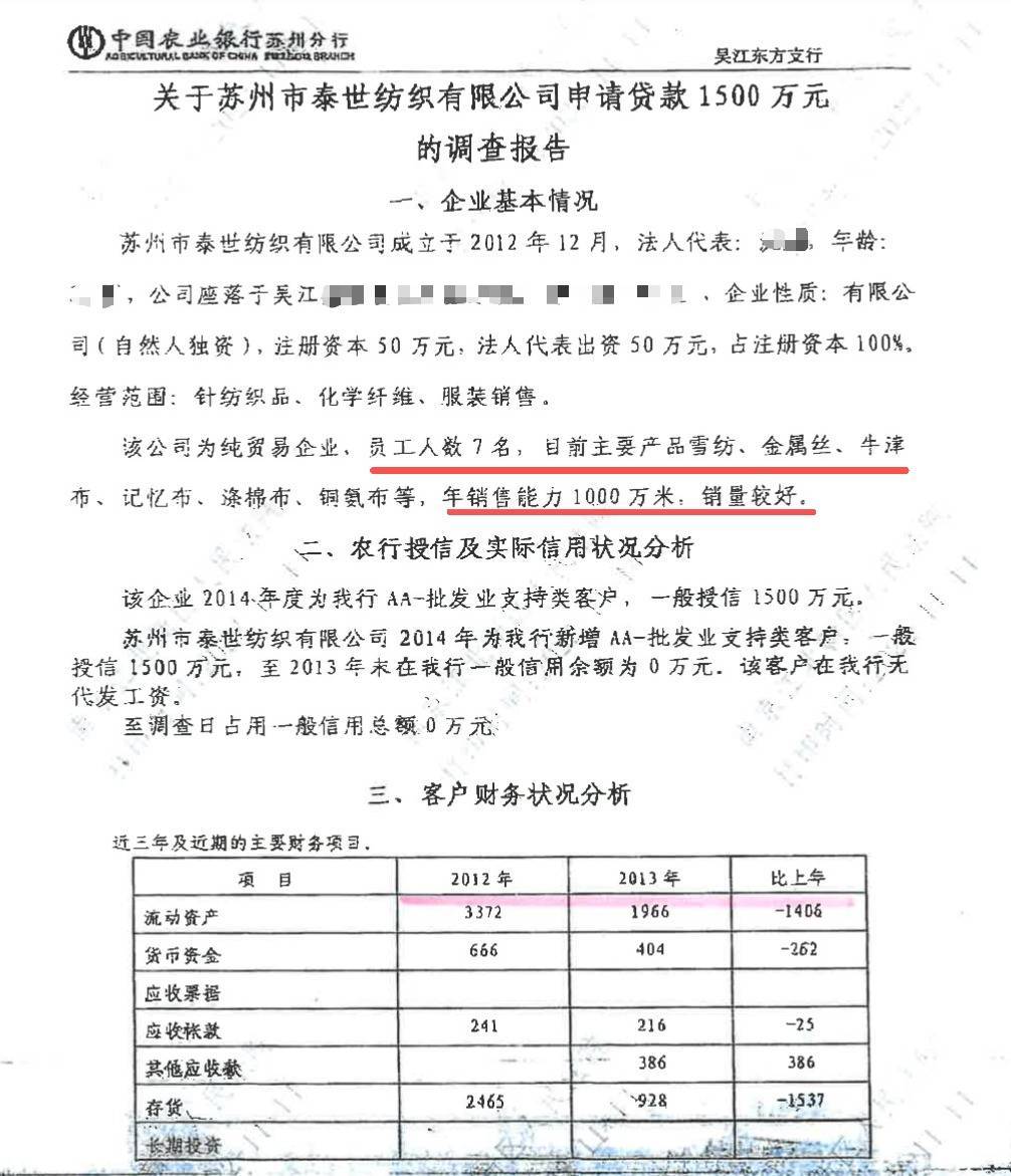 然而,据受访者提供的中国农业银行苏州分行吴江东方支行出具的关于泰世公司申请贷款1500万元的调查报告,泰世公司“员工人数7名”“年销售能力1000万米,销量良好”“2013年末实现销售8953万元、净利润368万元,销售收入、净利润比上年同期分别增加8391万元和329万元,充分说明企业生产经营状况良好,盈利能力较强”。