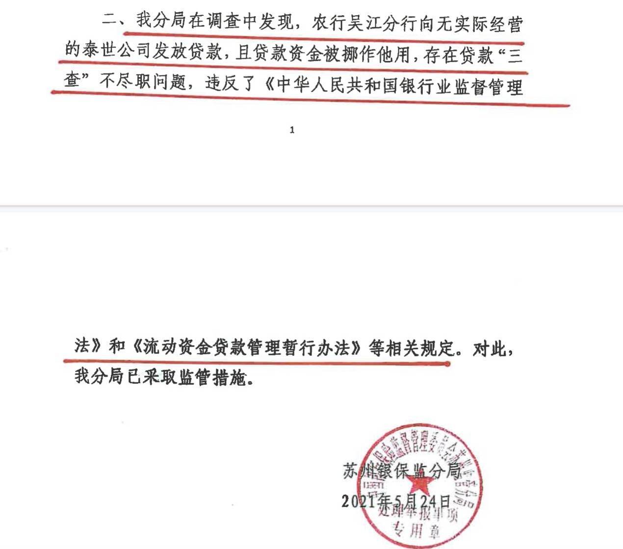 2021年5月,苏州银保监分局的调查结果确认,农行吴江分行向无实际经营的泰世公司发放贷款,且贷款资金被挪作他用,存在贷款“三查”不尽职问题,违反了《流动资金贷款管理暂行办法》等相关规定。对此,苏州银保监分局已采取监管措施。