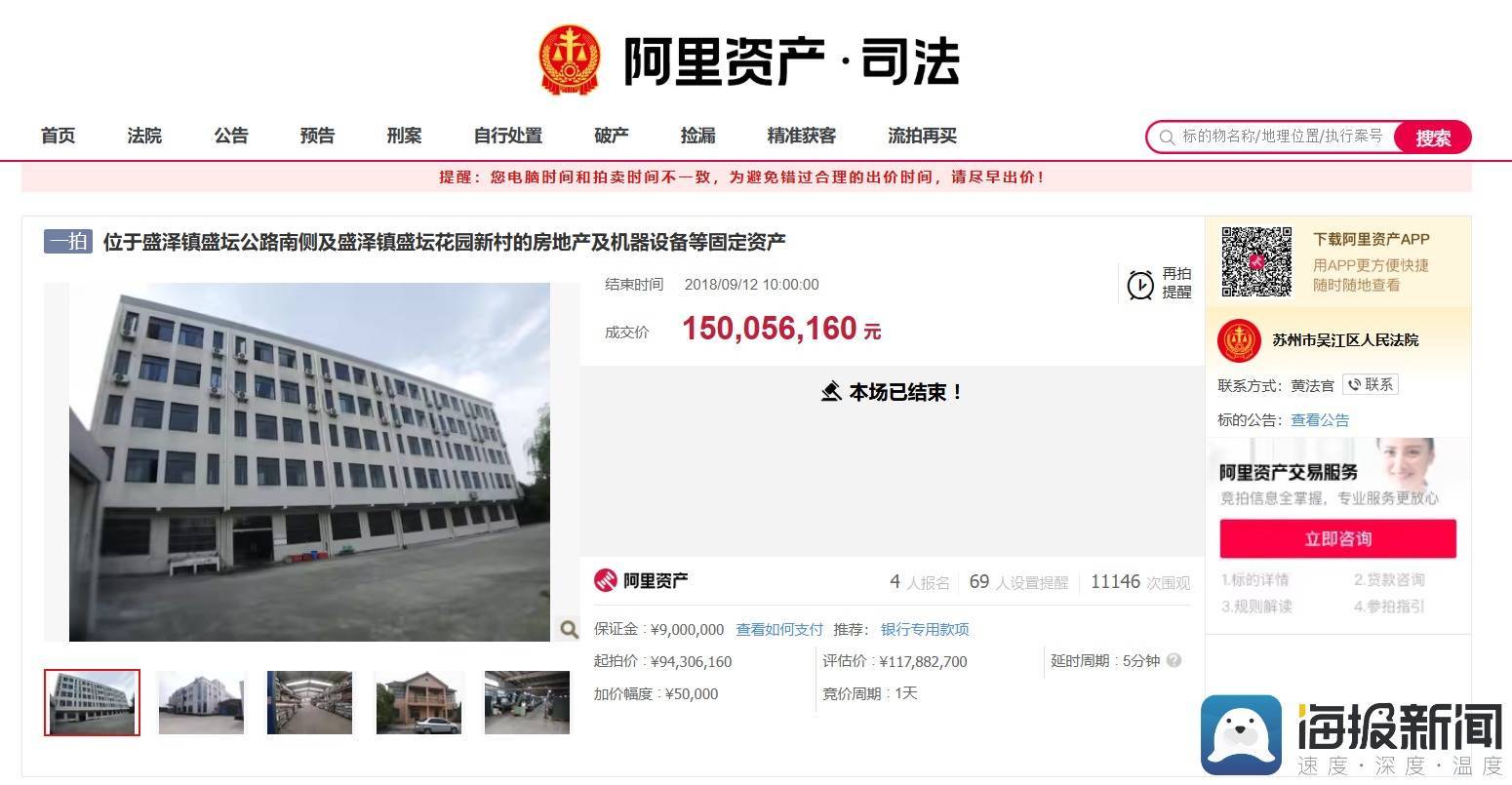 2018年9月12日,伟江公司名下位于盛泽镇盛坛公路南侧及盛坛花园新村的房地产、机器设备等固定资产在阿里拍卖平台被司法拍卖。拍卖公告显示,标的物包括多套房产及机器设备,评估总价1.178827亿元,起拍价9430.616万元,最终以1.5005616亿元的价格成交。