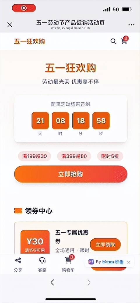 例如,销售人员准备在节假日做促销活动,只需在Meoo上输入活动规则,几分钟就能生成一个精美的H5活动页,并能展示转化数据。